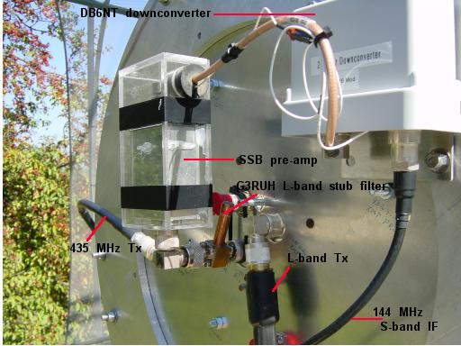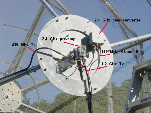 Here's the dish with the tri-band patch feed installed, first configuration. There are three coax lines going to the patch: 435 MHz Tx, 1.2 GHz Tx, and 144 MHz IF Rx from the S-band downconverter. Note that there is a separate pre-amp on S-band and the L-band notch filter is after the pre-amp. This created some desense from L-band Tx.