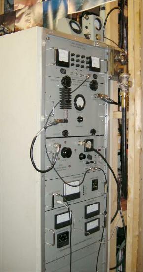 Here's a view of the amp in its functional location in an unfinished room behind my main shack. Bird wattmeters on the top measure output and "difference" from the 180 deg. combiner. 7/8" hardline runs directly to the dish feed.