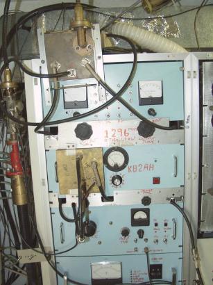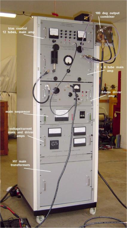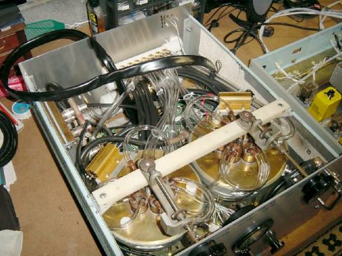 Here's the rebuild of the main amp showing the two 6-tube cavities. The 180 deg. ring splitter for input is at the back left. The manifolds for water and air cooling can be seen at the back right. Clear tubing is for water and black tubing is for air. Large flat cable connects to bias control unit. Filament transformers are located at the rear beneath the cooling tubing.