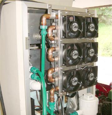 Here's the rear of the amp. showing the cooling system made from a hot water baseboard heater unit and 6 110 VAC muffin fans. The white PVC reservoir for distilled water is at the lower right. The main amp contains 3 PVC manifolds, one for water in, one for water out, and a larger one visible below these for air in to cool the main amp cathodes.