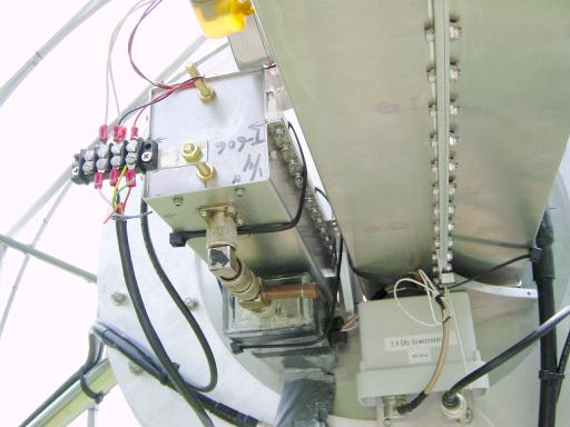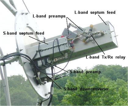 Bottom view of septum feeds. S-band preamp (left) and S-band downconverter (right) are easily seen.