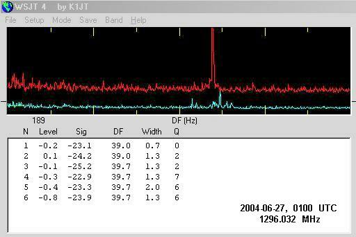 Averaged EME echo (red spike) on L-band running 50 watts at septum feed using "Echo mode" in WSJT 4 software. The -23.9 dB signal strength is relative to the noise level across the 2500 Hz passband. The blue graph is real-time, non-averaged signal.
