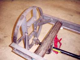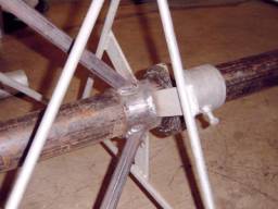 This is the beginning of the clothesline pole mount, based on a design by Robert Suding. The side arms are 4" wide I-beams hand made from 1/4" thick flat sheet steel. The "T" is 4" steel pipe. Steel discs with 1" nuts were welded into each end of the "T" bar to accept the two 1" hardened steel bolts which form the elevation axis. The axis pivots on 1" flange bearings mounted on the side arms. The mounting circle is 2 feet in diameter and was rolled from 1/4" x 2" steel.