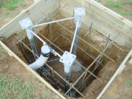 A four foot deep hole with re-bar for the base (over kill!). A 3" gray PVC conduit carries the drive controls and antenna coax. Note that the base has been carefully aligned to vertical and locked in place with a small amount of concrete around each of the three legs to prevent movement during the main concrete pour. If necessary, fnal adjustments can be made by shimming the leg mounts.