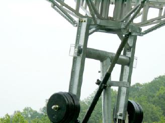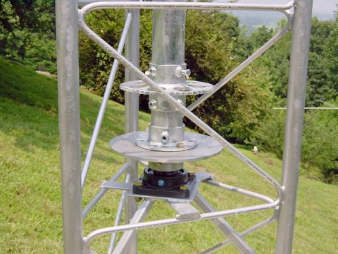 The mounting of the azimuth shaft at the top of the tower section. Note the large thrust bearing and the bracing for the tower loading.