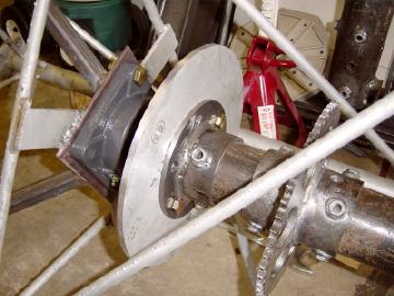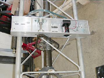 The lower end of the azimuth shaft. The drive sprocket is a 13" motorcycle sprocket. The aluminum plate below the sprocket (to the left) is the disc for a braking assembly which has yet to be designed.