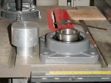 The bottom azimuth axis flange bearing is on the right. On the left is a machined aluminum adapter to allow the 3.5" aziumuth shaft to mount to the bearing. A hole in the bottom of this adapter serves as the attachment for the shaft of the azimuth axis potentiometer.